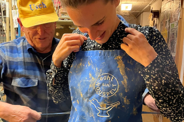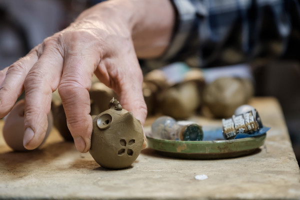 Together with the enthusiastic hobby potters from Nospelt, a typical Luxembourgish « Péckvillchen », a bird-shaped ceramic pipe fired from clay, is made. Each hand-made « Péckvillchen » is unique.